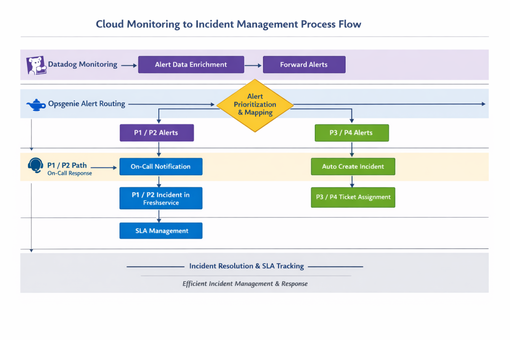 Opsgenie served as the central alert intelligence layer, classifying alerts consistently into P1–P4 based on impact and business rules. We used APIs to link DataDog to Opsgenie.